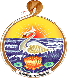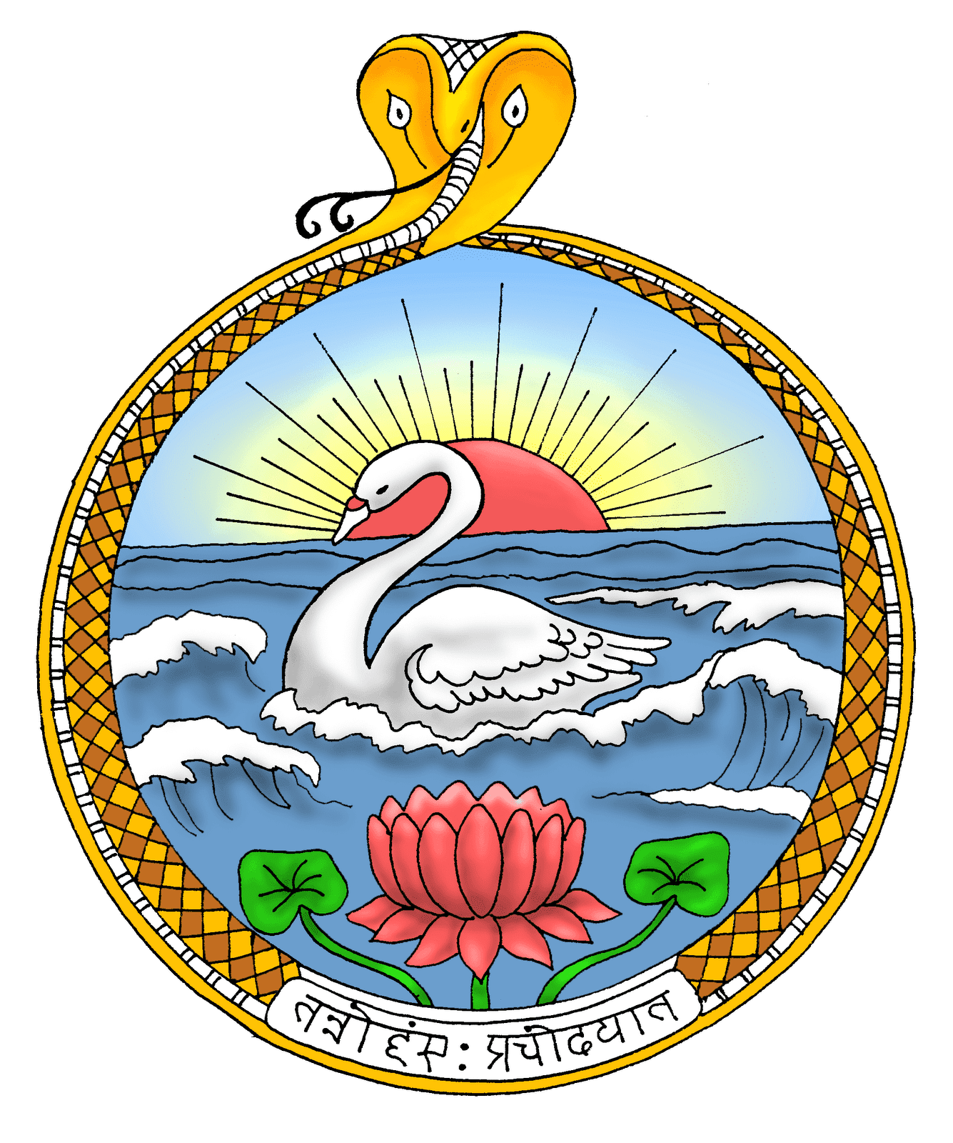 “The wavy waters in the picture are symbolic of Karma, the lotus of Bhakti, and the rising-sun of Jnana. The encircling serpent is indicative of Yoga and awakened Kundalini Shakti, while the swan in the picture stands for Paramatman. Therefore, the ideal of the picture is that by the union of Karma, Jnana, Bhakti and Yoga, the vision of the Paramatman is obtained.”